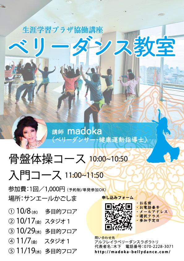 2025年10月8日より、サンエールかごしまの協働講座にてアルフレイラベリーダンスラボラトリによる「ベリーダンス教室 骨盤体操クラス」「ベリーダンス教室 入門クラス」を開催することとなりました!